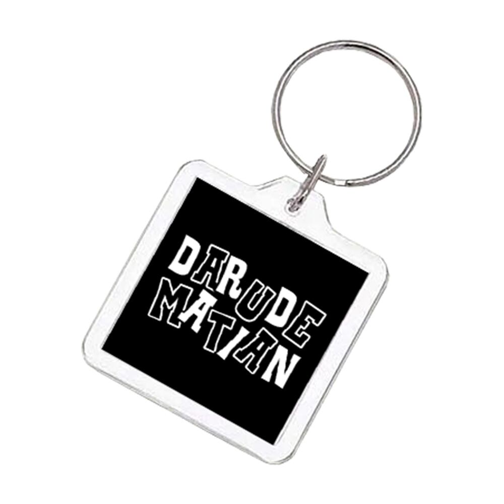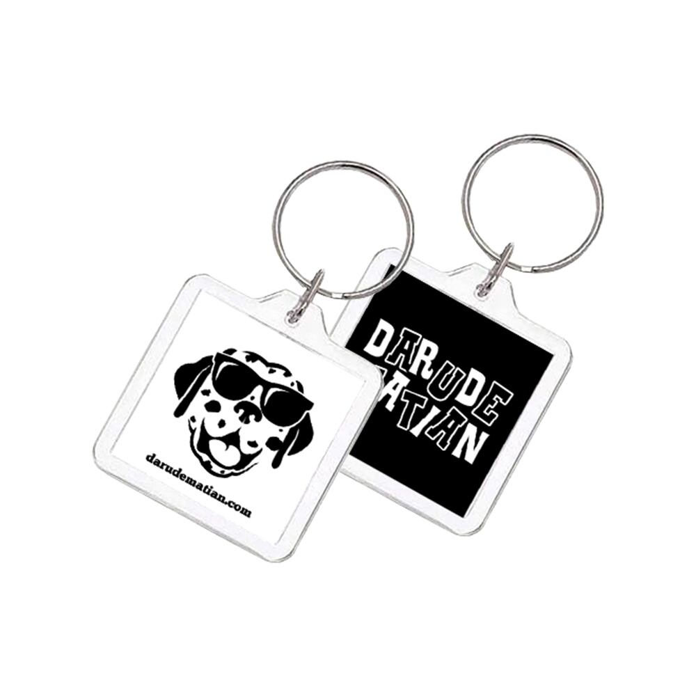 32mmサイズの正方形キーホルダーです。 片面が白地にDARUDEMATIAN犬デザイン、反対面が黒地に二段ロゴの両面デザインです。